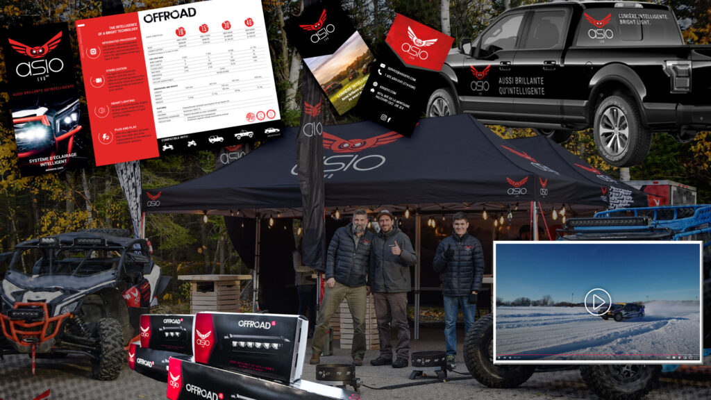 Image de marque : packaging, matériel promotionnel, fiches produits, événement de lancement produit lors d’un événement motorsport.